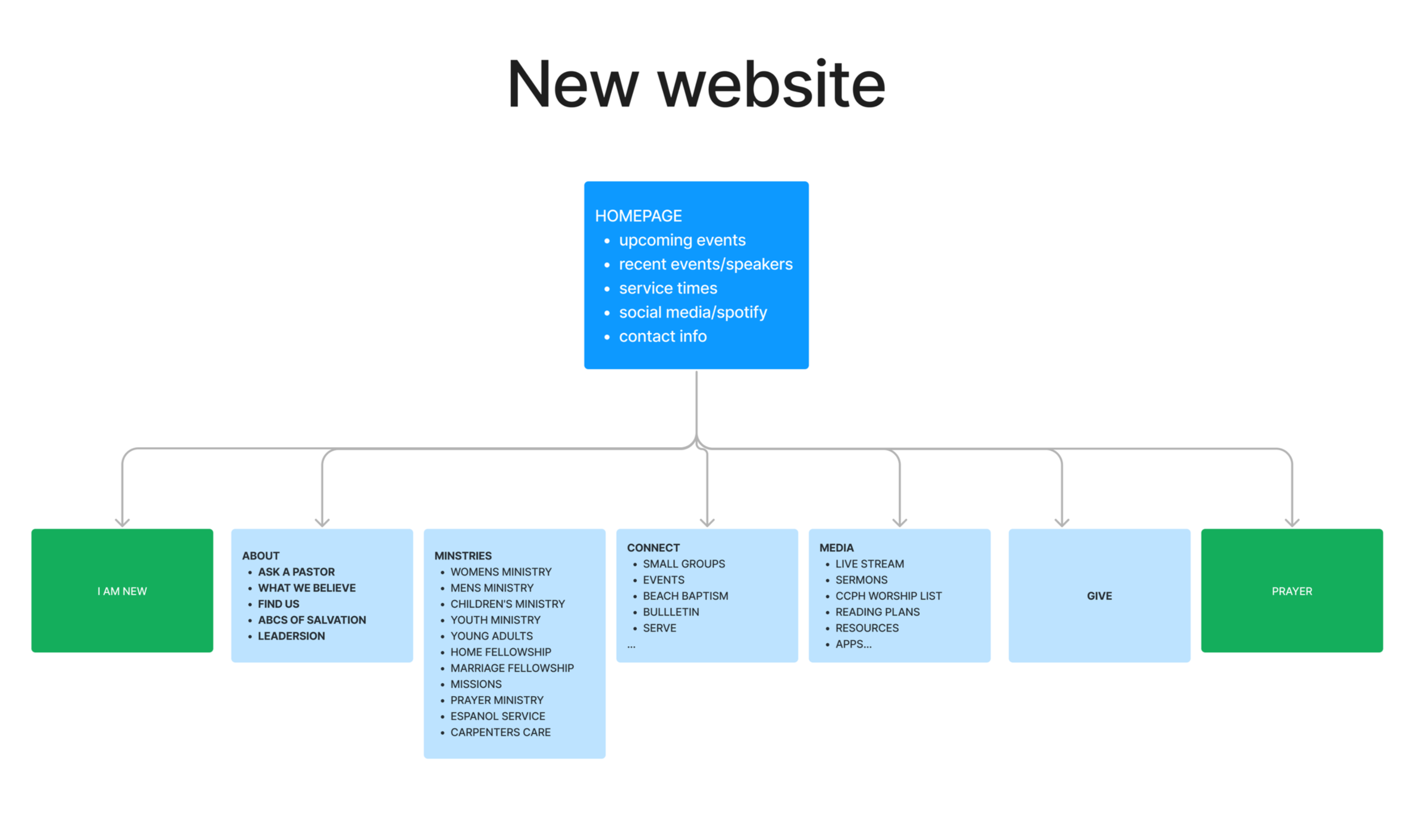 Streamlined the site from 39 pages to 30 by eliminating 10 redundant pages and removing 5 outdated ones. Reorganized navigation to prioritize visitor needs: elevated "I Am New" and "Prayer" to top-level, consolidated scattered volunteer pages into one "Serve" section.
